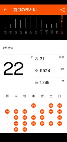 例によって遅い、てか遅すぎる先月のロードバイクライド統計報告。 走行距離657.4㎞ 獲得標高1,788m 例年であれば2月は一番寒い時期。しかし今年は暖冬で1月に続いて積雪はなし。この機に乗じて調子を上げていきたいところ。 メインのコースは1月に続き近所…