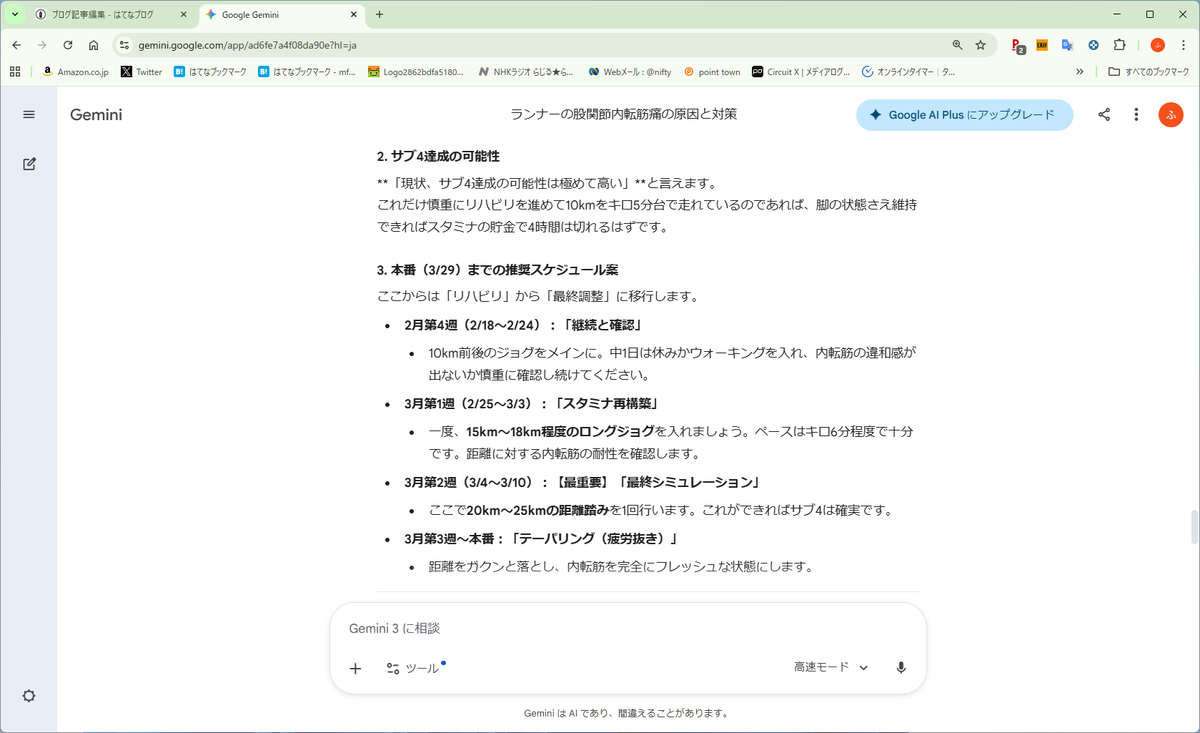 その後もGeminiのアドバイスを参考に、再び痛みが出ないか慎重に確認しながらゆっくりジョギング。昨日ようやく15㎞まで問題なく走れることを確認した。